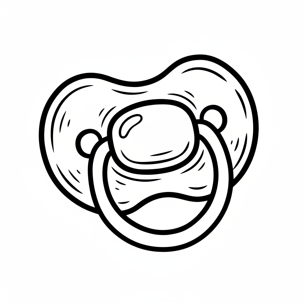 Schwarz-weiße Strichzeichnung eines Baby-Schnullers mit Schild, Knopf und Ring.