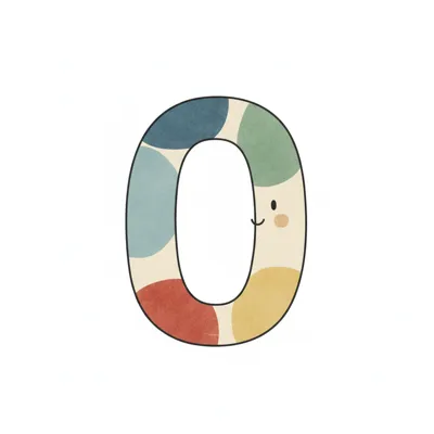 Fröhliche Zahl Null mit bunten Punkten und lächelndem Gesicht auf weißem Hintergrund.