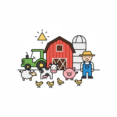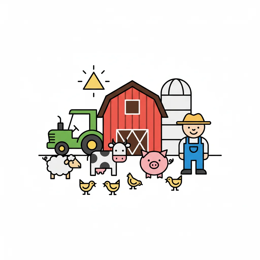 Bunte Farm-Illustration mit Bauer, Traktor, Scheune und verschiedenen Nutztieren.