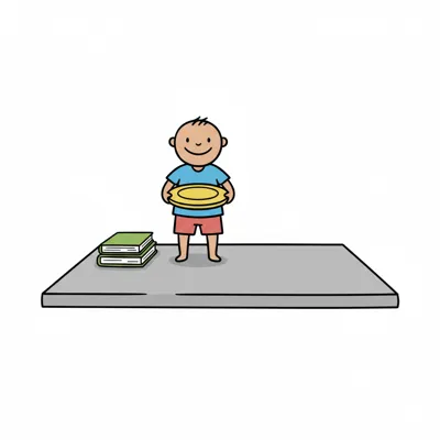 Ein lächelnder Cartoon-Junge hält einen Teller neben einem Stapel Bücher auf einer grauen Oberfläche.