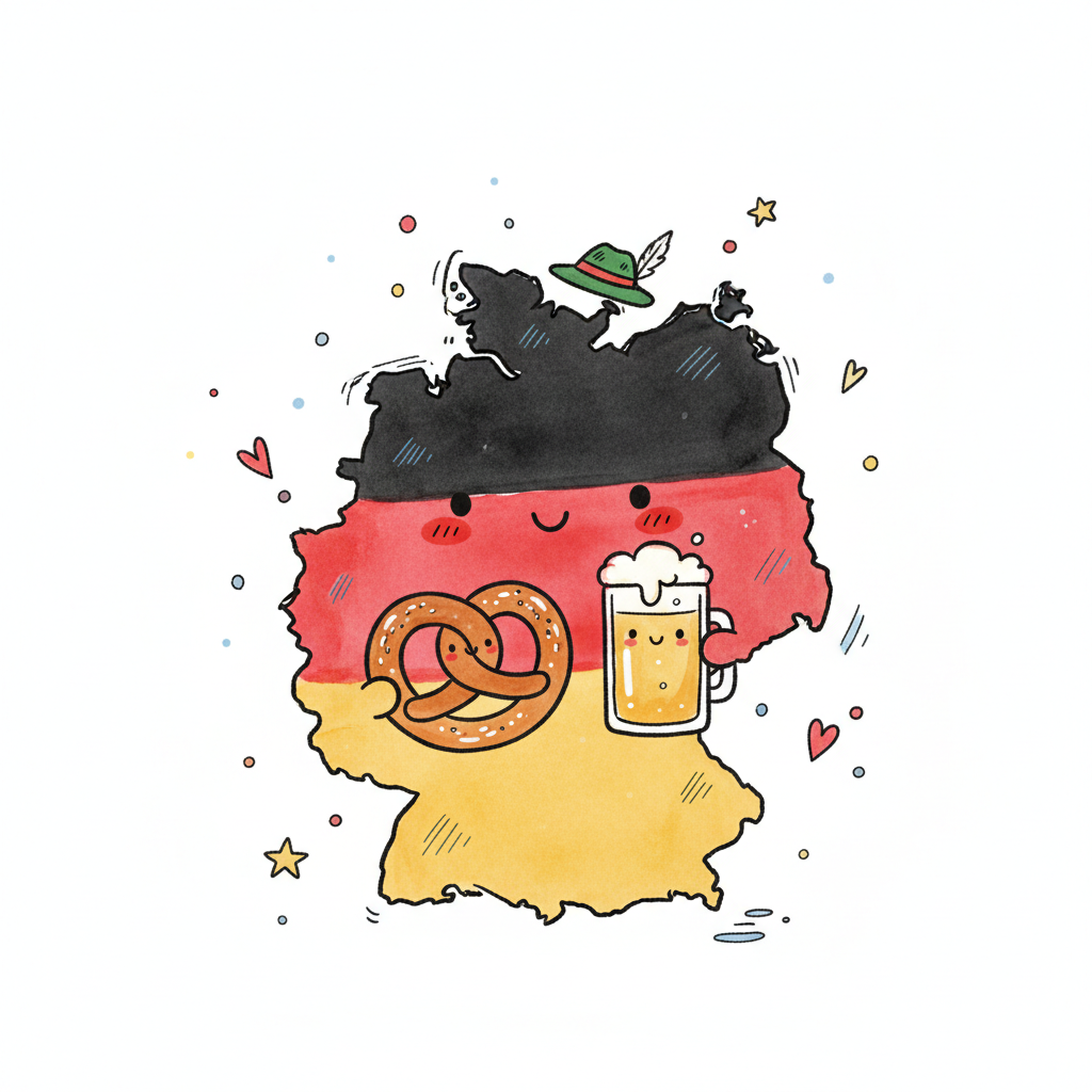 Niedliche Cartoon-Deutschlandkarte mit Brezel, Bier und bayerischem Hut.