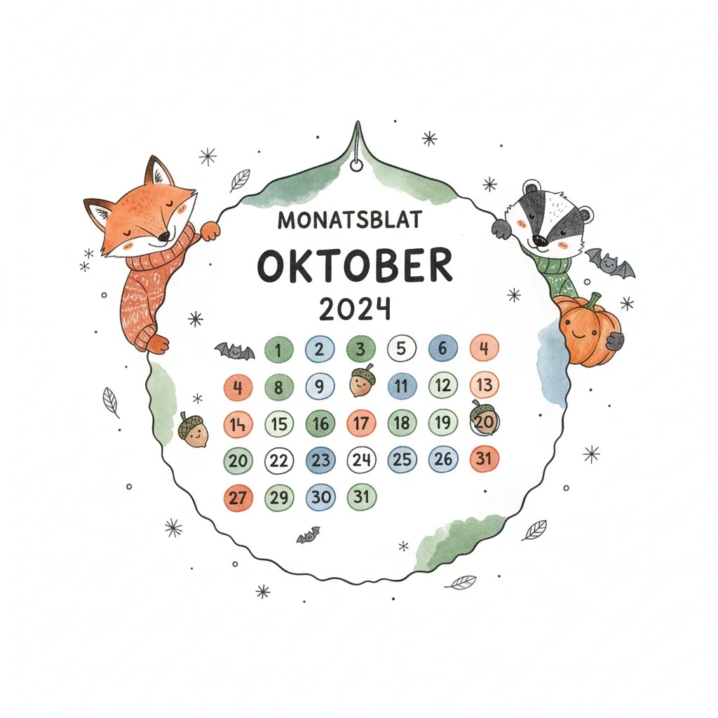 Niedlicher Aquarell-Kalender für Oktober 2024 mit Fuchs, Dachs und Herbstmotiven.