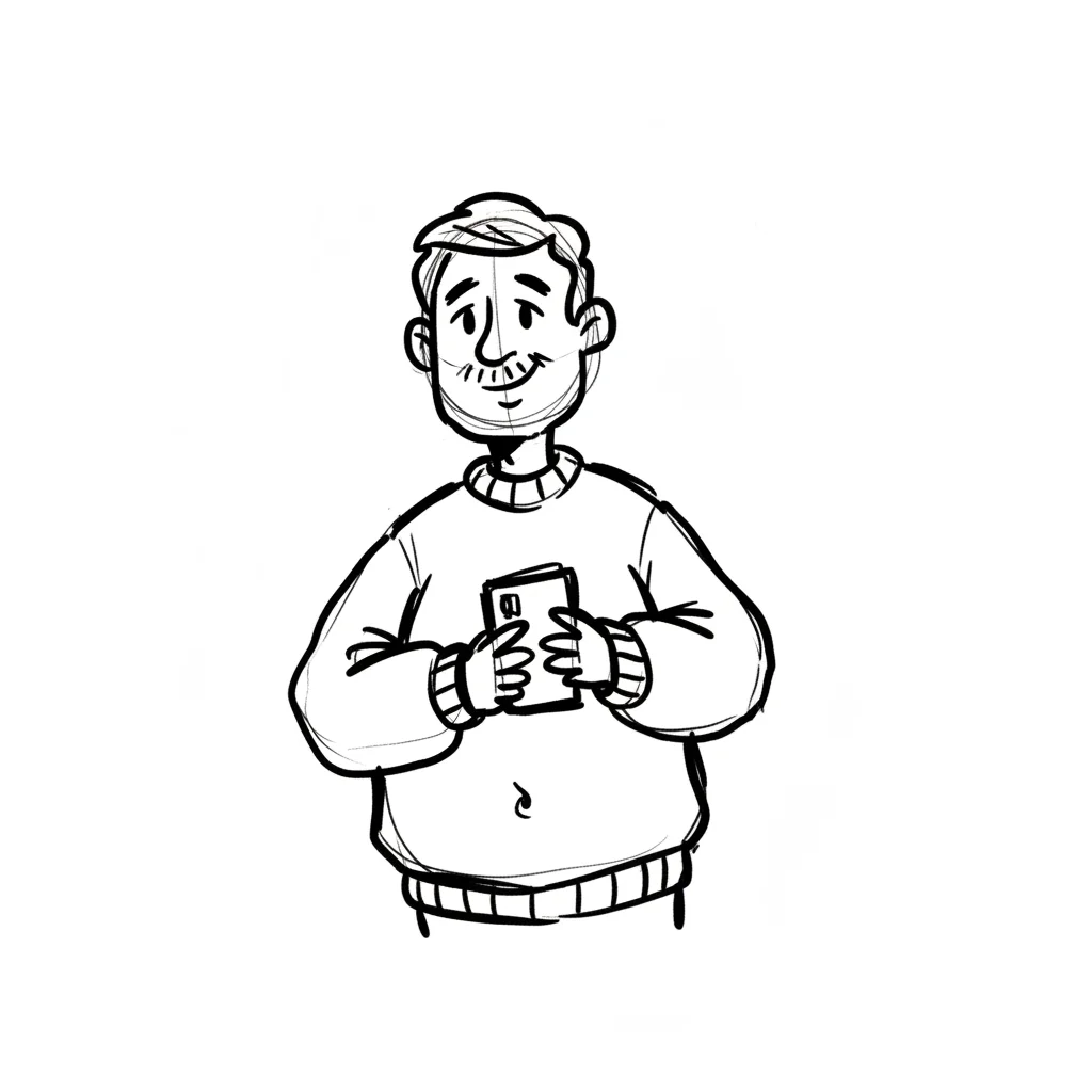 Männlicher Cartoon-Charakter mit Bart, Mütze und festlichem Pullover.
