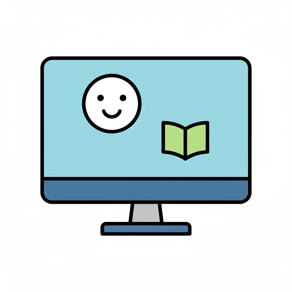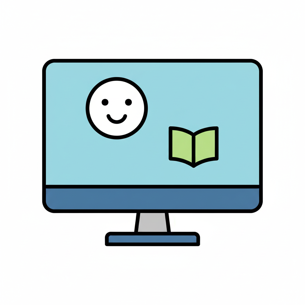 Digitales Lernen: Monitor-Icon mit Smiley und Buch auf dem Bildschirm.