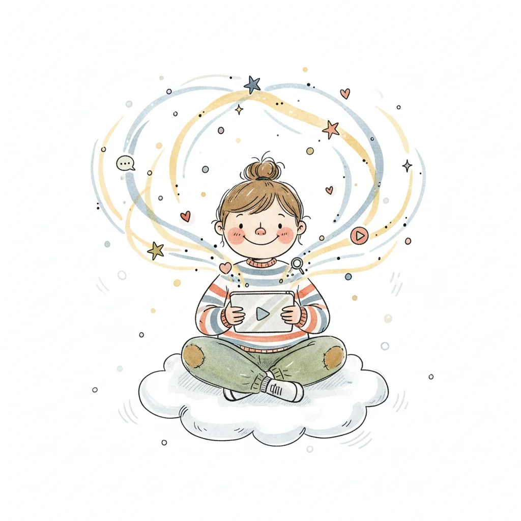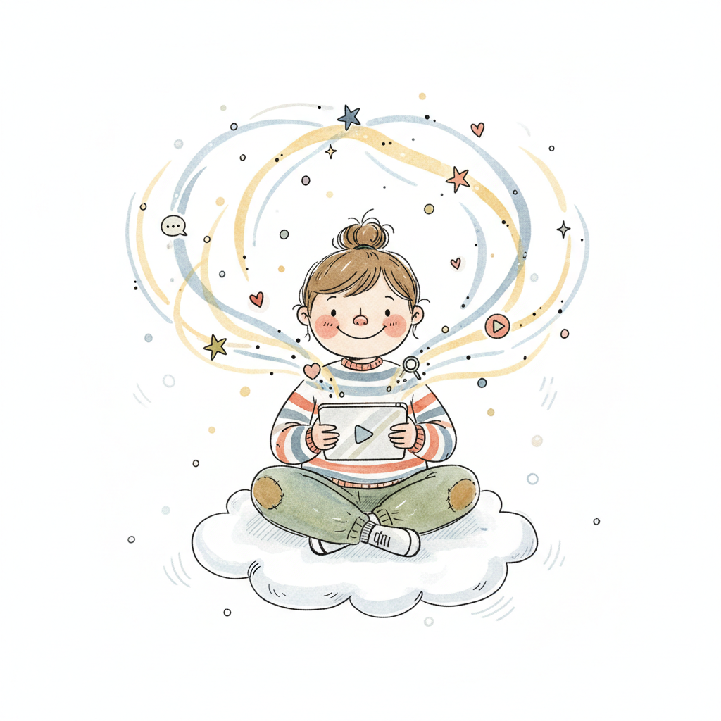 Glückliches Mädchen auf Wolke mit Tablet, umgeben von digitalen Symbolen und Social Media Icons.