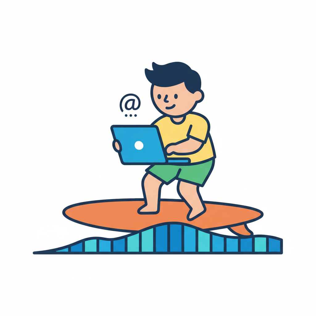 Junge surft mit Laptop auf Welle, @-Symbol zeigt Online-Arbeit oder Kommunikation.