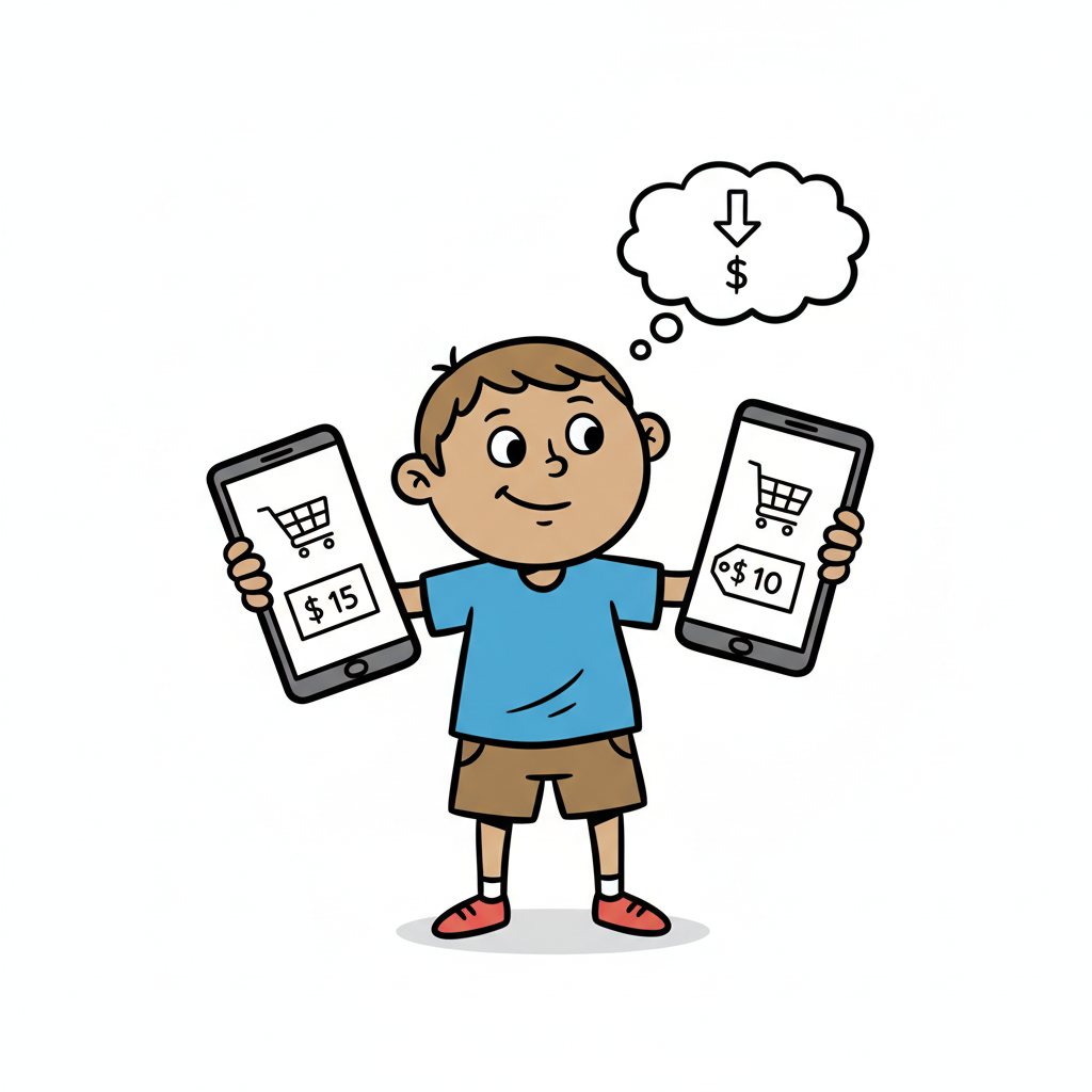 Junge vergleicht Preise auf zwei Smartphones ($15 vs. $10) und denkt ans Sparen.