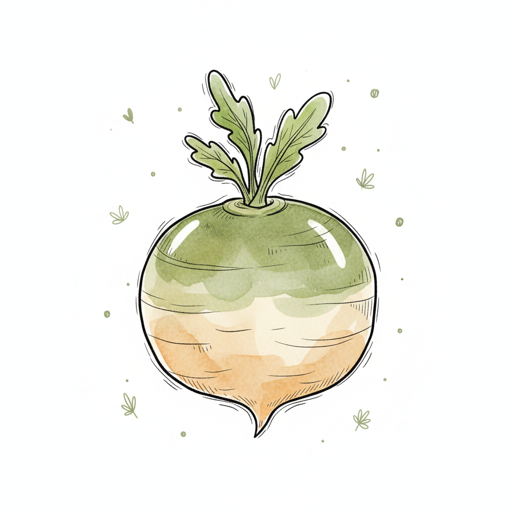 Aquarell-Illustration einer Rübe mit grünen Blättern und einem grün-orangen Körper auf Weiß.