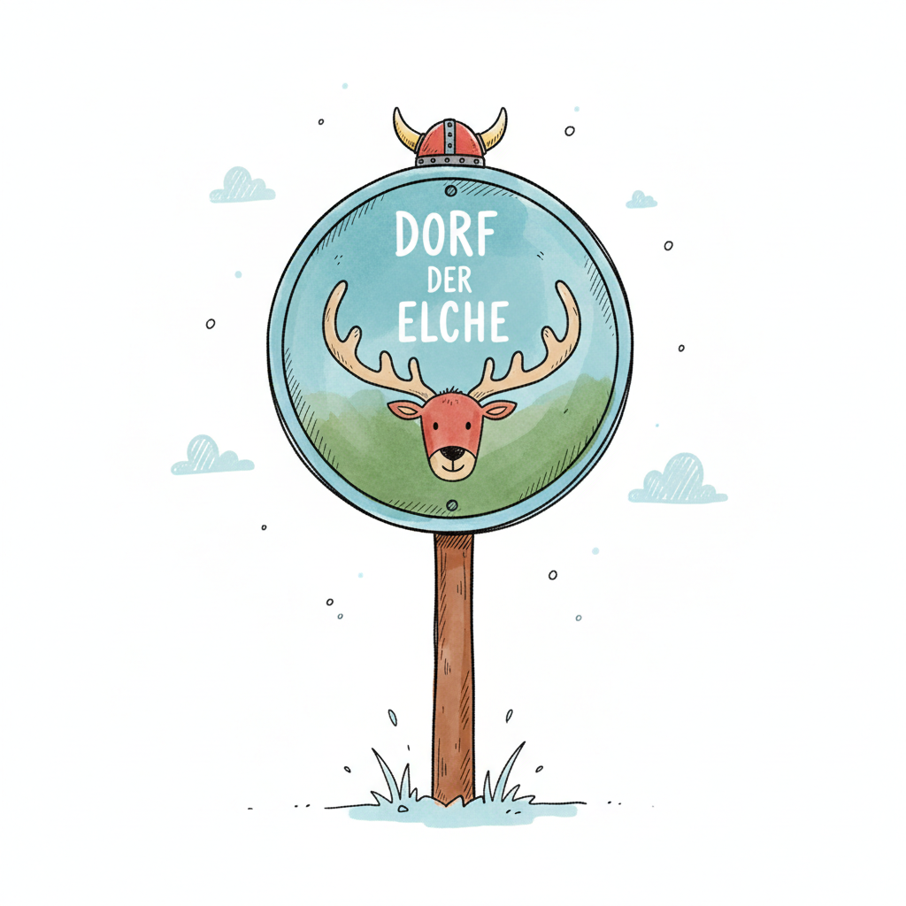 Niedliches Cartoon-Schild "Dorf der Elche" mit Elchgesicht und Wikingerhelm auf weißem Hintergrund.