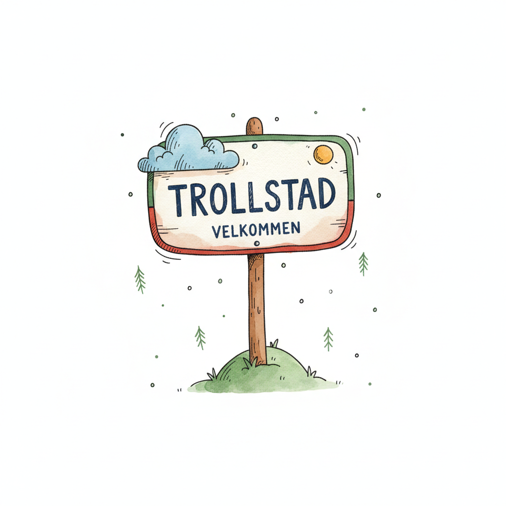 Niedliches, handgezeichnetes Schild 'Trollstad Velkommen' mit Wolke, Sonne und Bäumen.