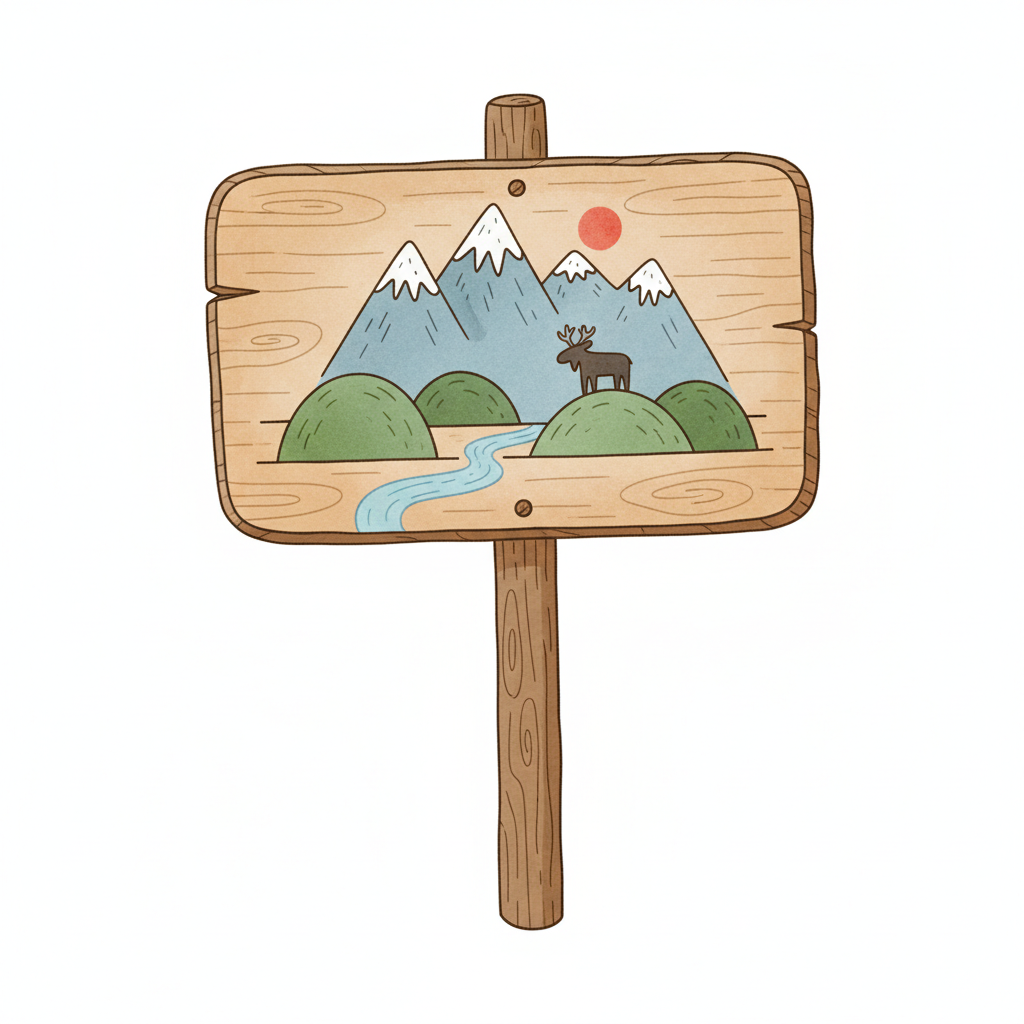 Ein Holzschild zeigt eine idyllische Berglandschaft mit Elch, Fluss und Sonne im Cartoon-Stil.