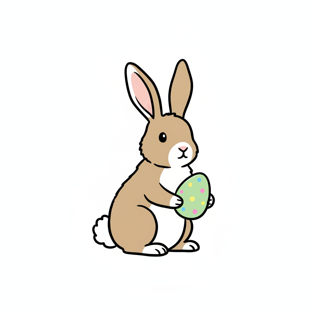 Ein niedlicher Hase hält ein buntes Ei in seinen Vorderpfoten.