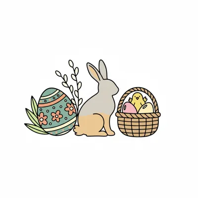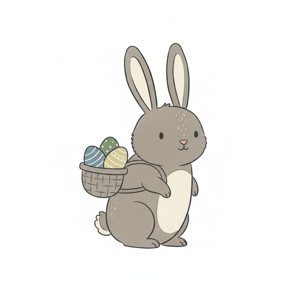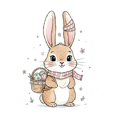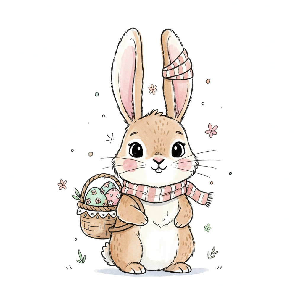 Ein niedlicher Hase mit einem Korb voller Eier und einem Schal.