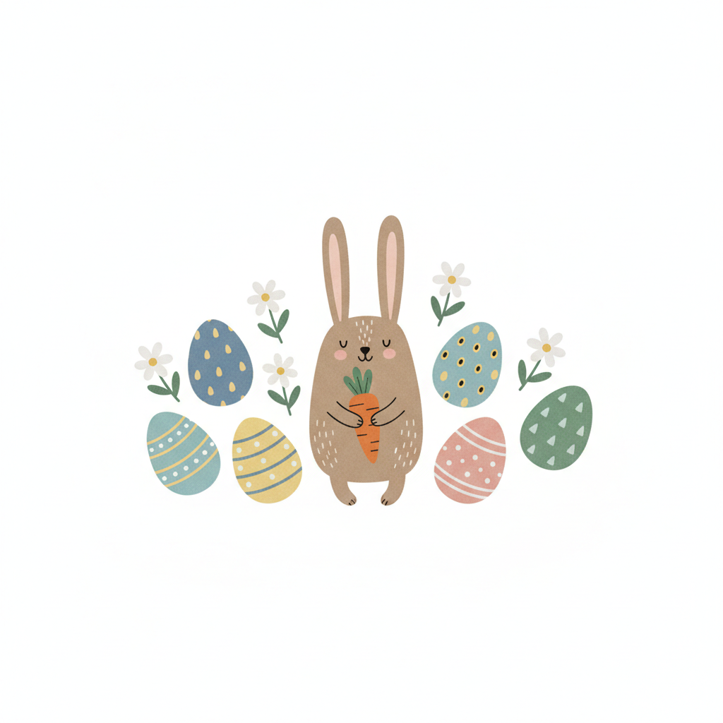 Ein niedlicher Hase mit einer Karotte und bunten Eiern um ihn herum.