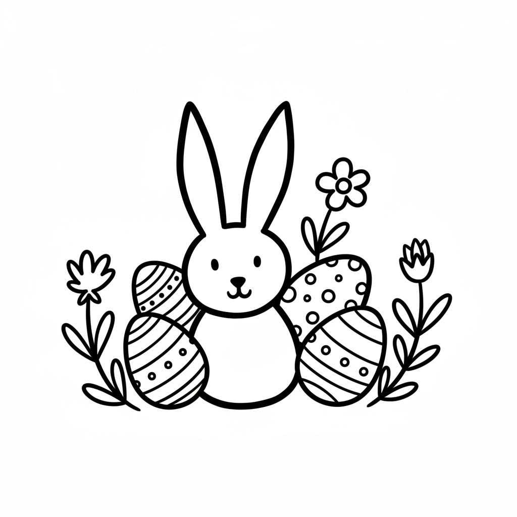Ein niedlicher Hase mit bemalten Eiern und Blumen im Hintergrund.