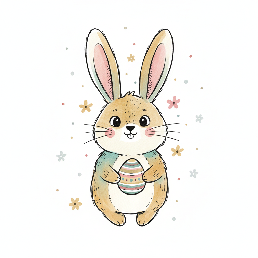 Niedlicher Hase hält ein buntes Ei umgeben von Blumen und bunten Punkten.
