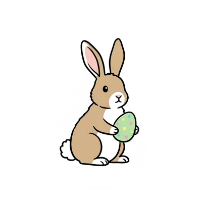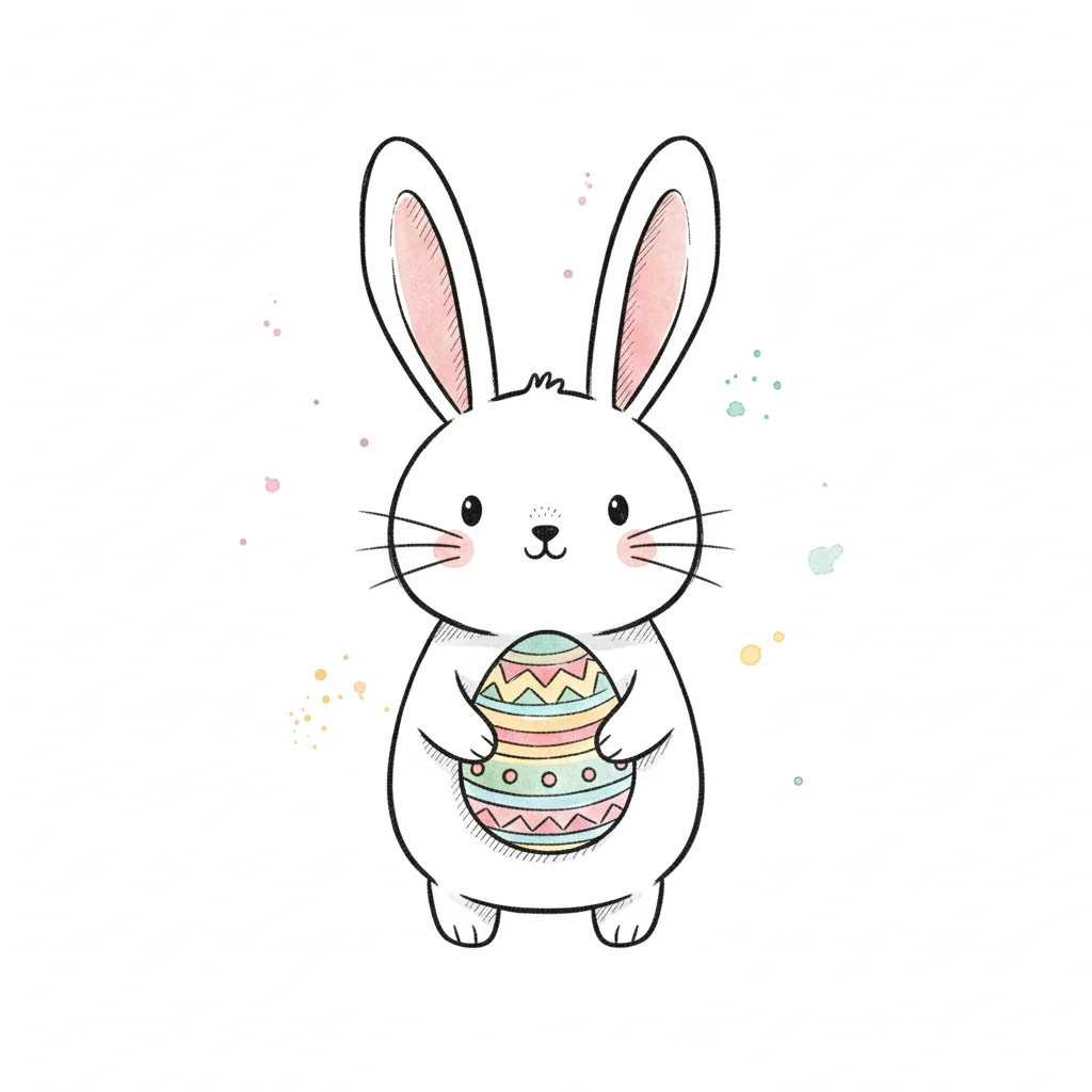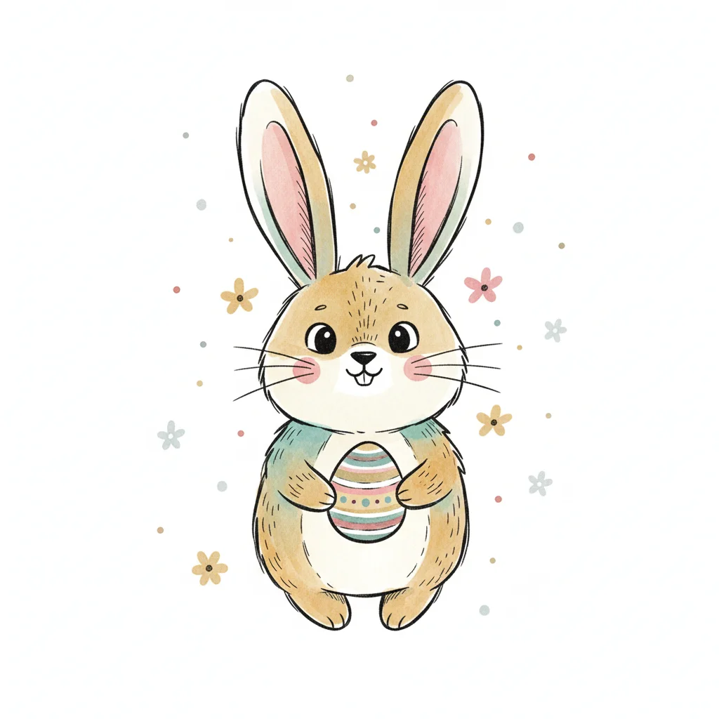 Ein niedlicher Hase hält ein buntes Osterei voller Muster.