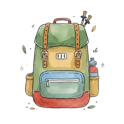 Bunter Rucksack mit Wasserflasche und Wanderausrüstung.