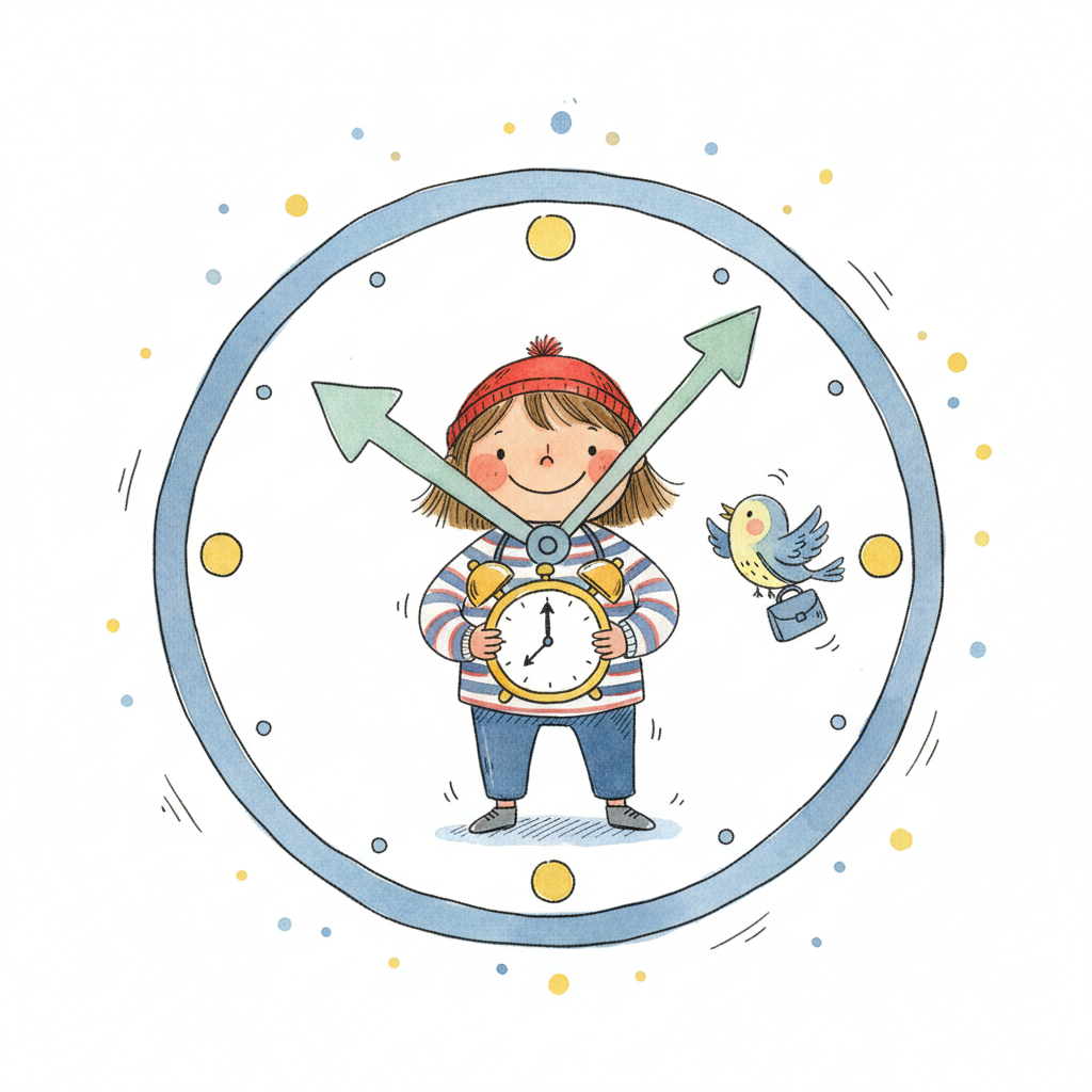 Ein lächelndes Kind hält einen Wecker in einer großen Uhr, daneben ein Vogel mit Koffer.