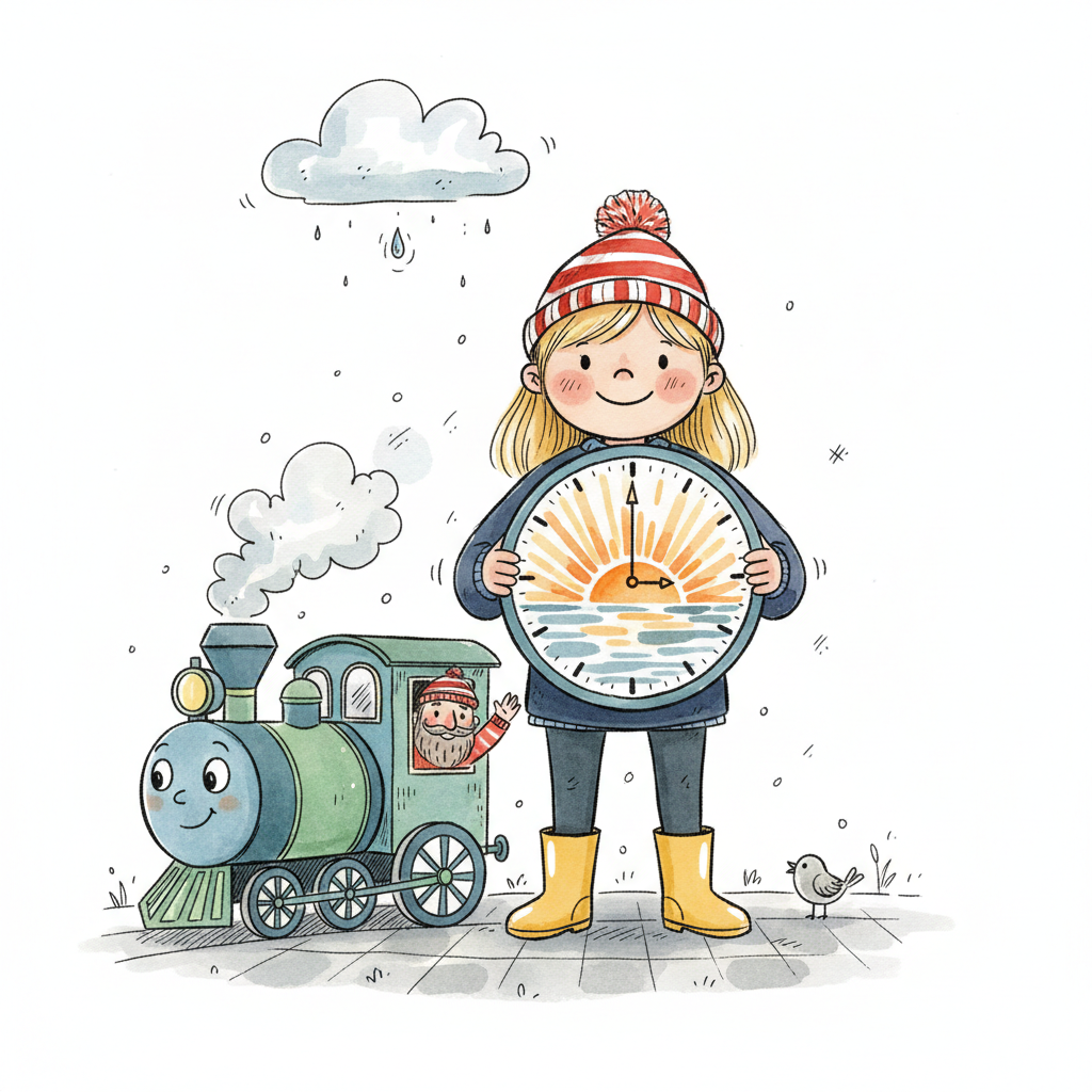 Mädchen hält Uhr mit Sonnenaufgang/Untergang, neben Zug mit Mann, bei Regen/Schnee.