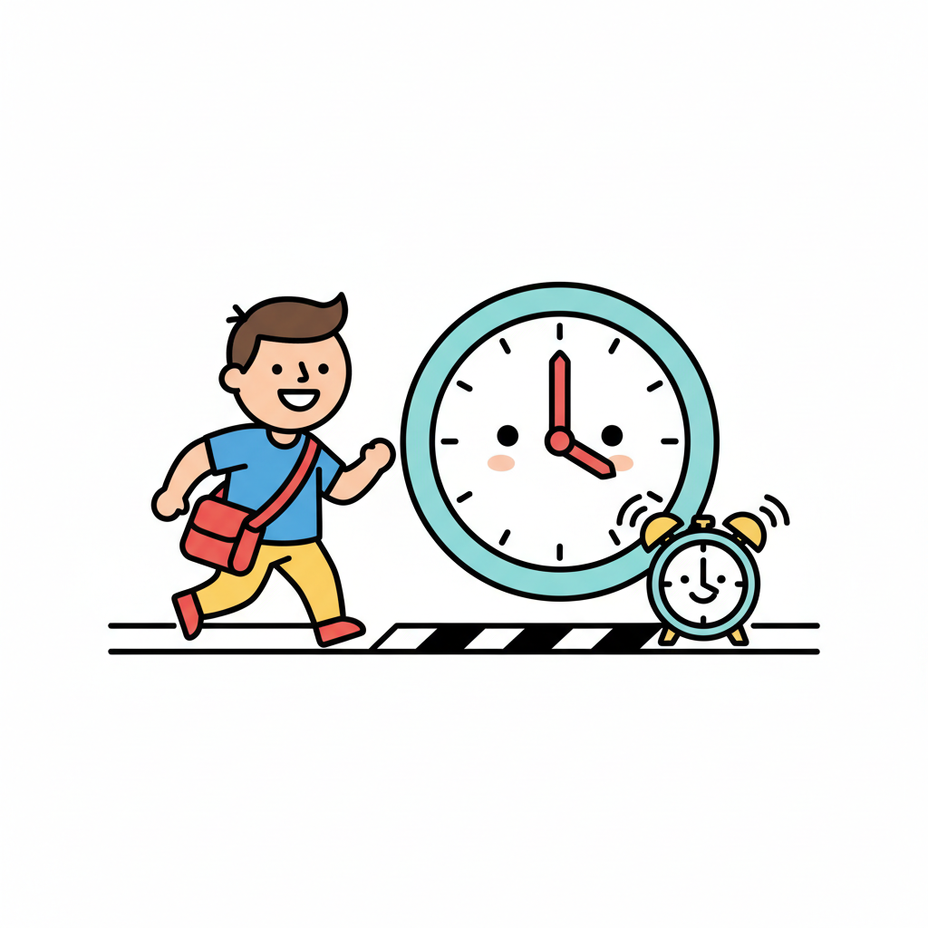 Ein Junge eilt an einer lächelnden Uhr und einem klingelnden Wecker vorbei.