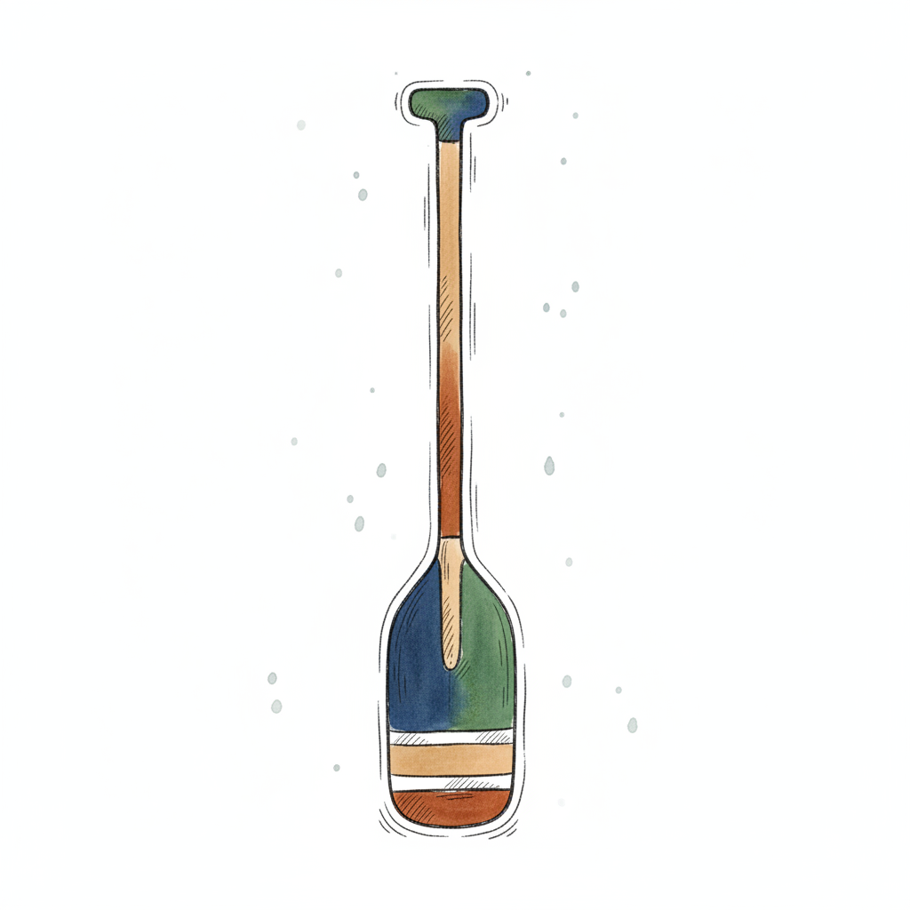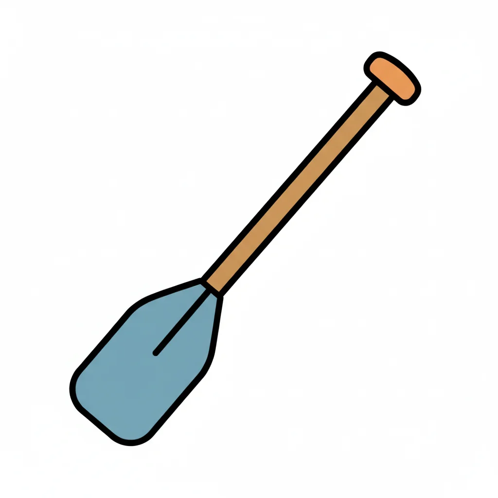 Ein illustriertes Paddel mit Holzgriff und blauer Klinge auf weißem Hintergrund.