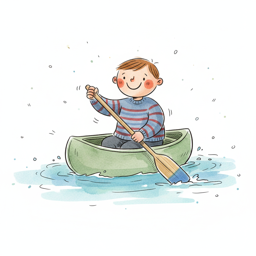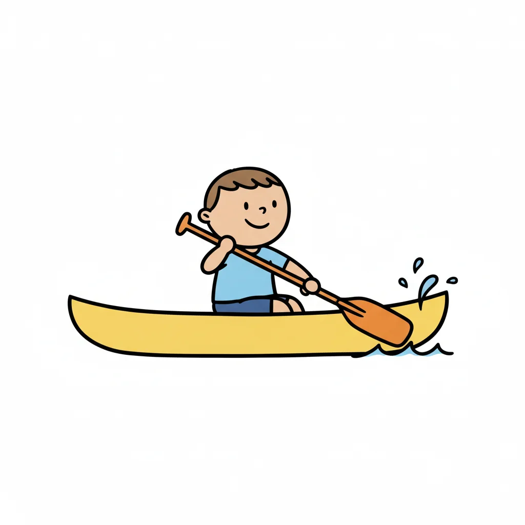 Ein lächelnder Cartoon-Junge paddelt in einem gelben Kanu, Wasser spritzt.