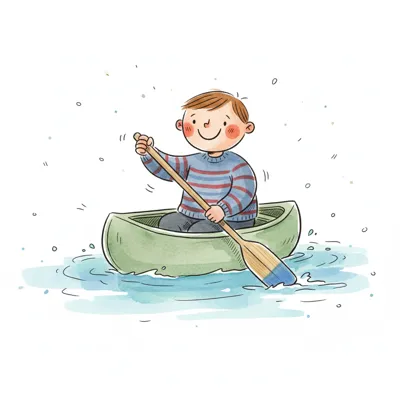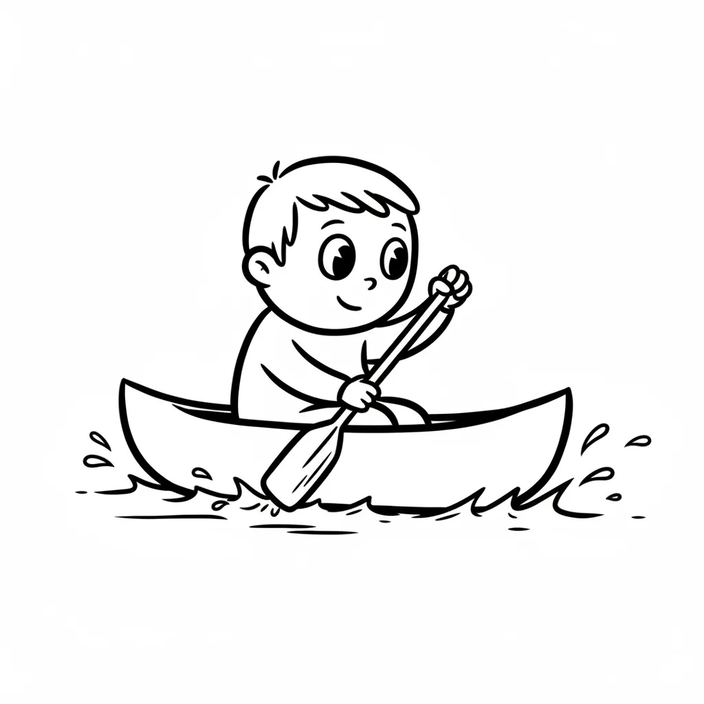 Schwarz-weiß-Cartoon eines lächelnden Jungen, der in einem Kanu paddelt und Wasser spritzt.
