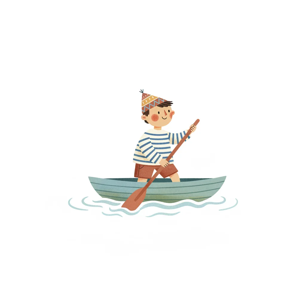 Fröhlicher Cartoon-Junge in gestreiftem Shirt und Hut rudert in einem kleinen Boot auf dem Wasser.