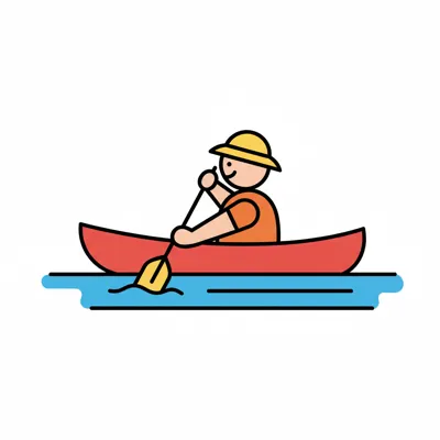 Stilisierte Illustration einer Person mit Hut, die in einem roten Kanu auf blauem Wasser paddelt.