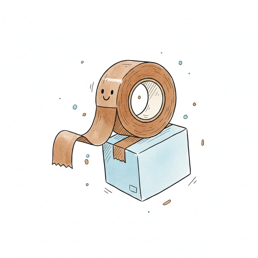 Eine lachende Klebebandrolle sitzt auf einem Paket.