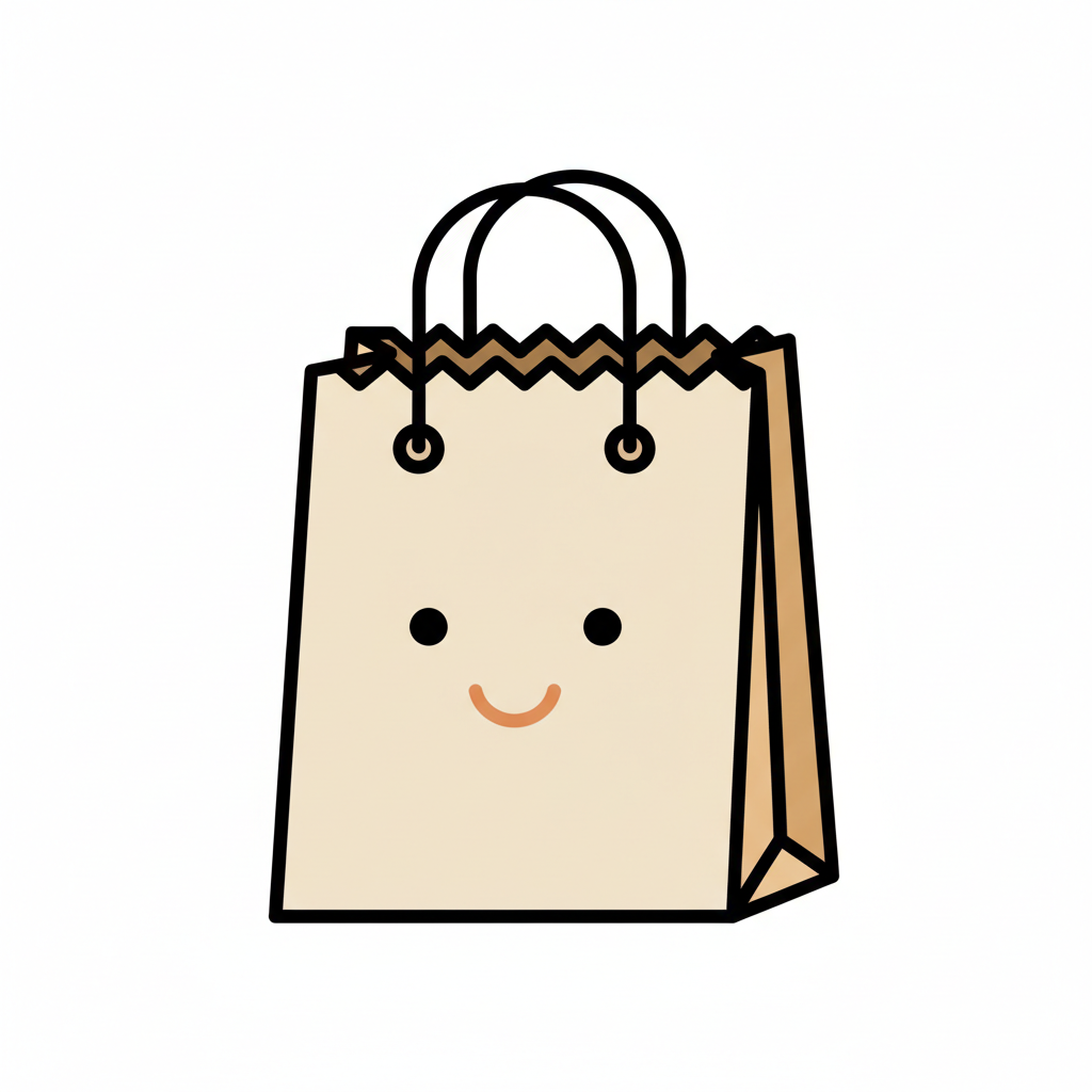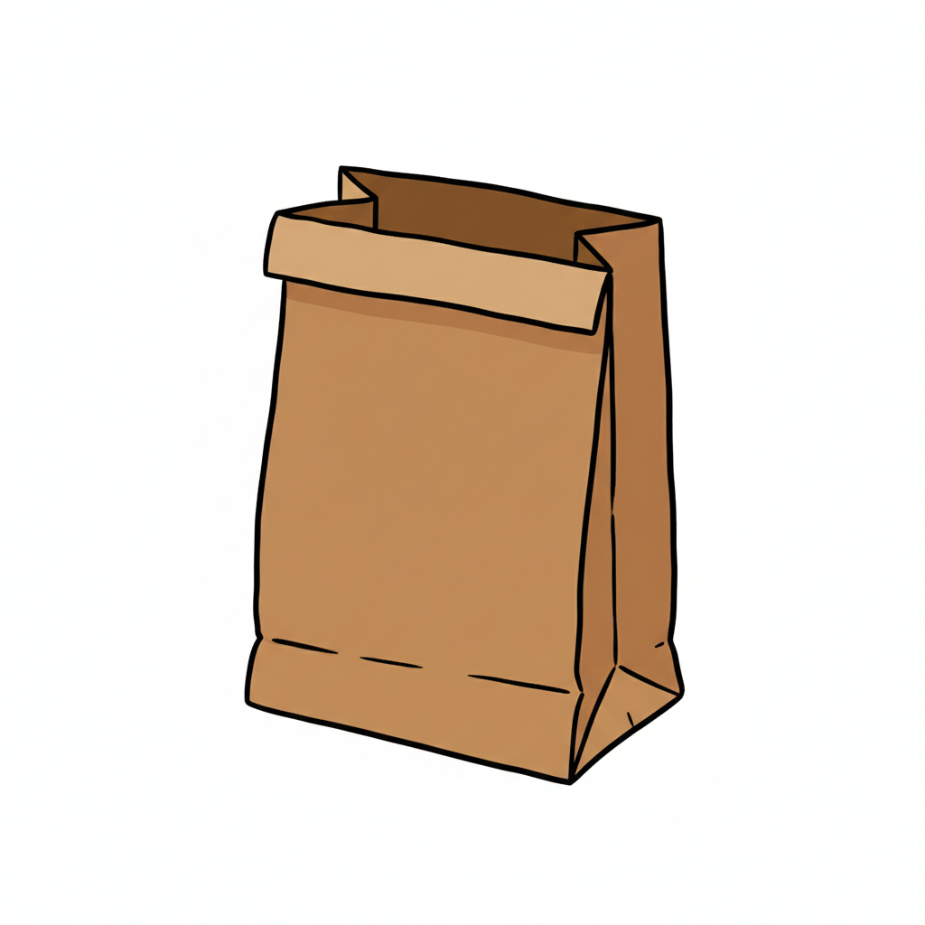 Eine braune Papiertüte, einfach gezeichnet, steht aufrecht mit leicht geöffnetem oberen Rand.