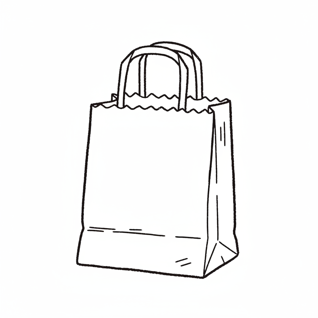 Schwarz-weiße Strichzeichnung einer Papiertüte mit Henkeln auf weißem Hintergrund.