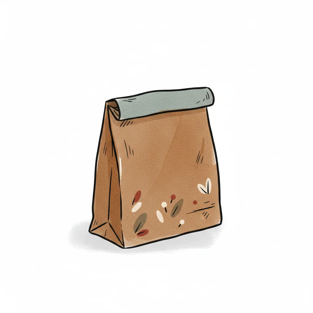 Illustrierte braune Papiertüte mit gerolltem Rand und dezenten Blattmotiven.