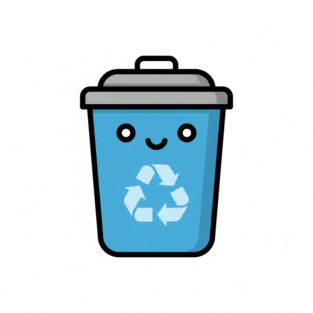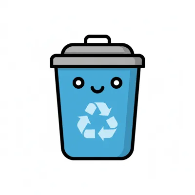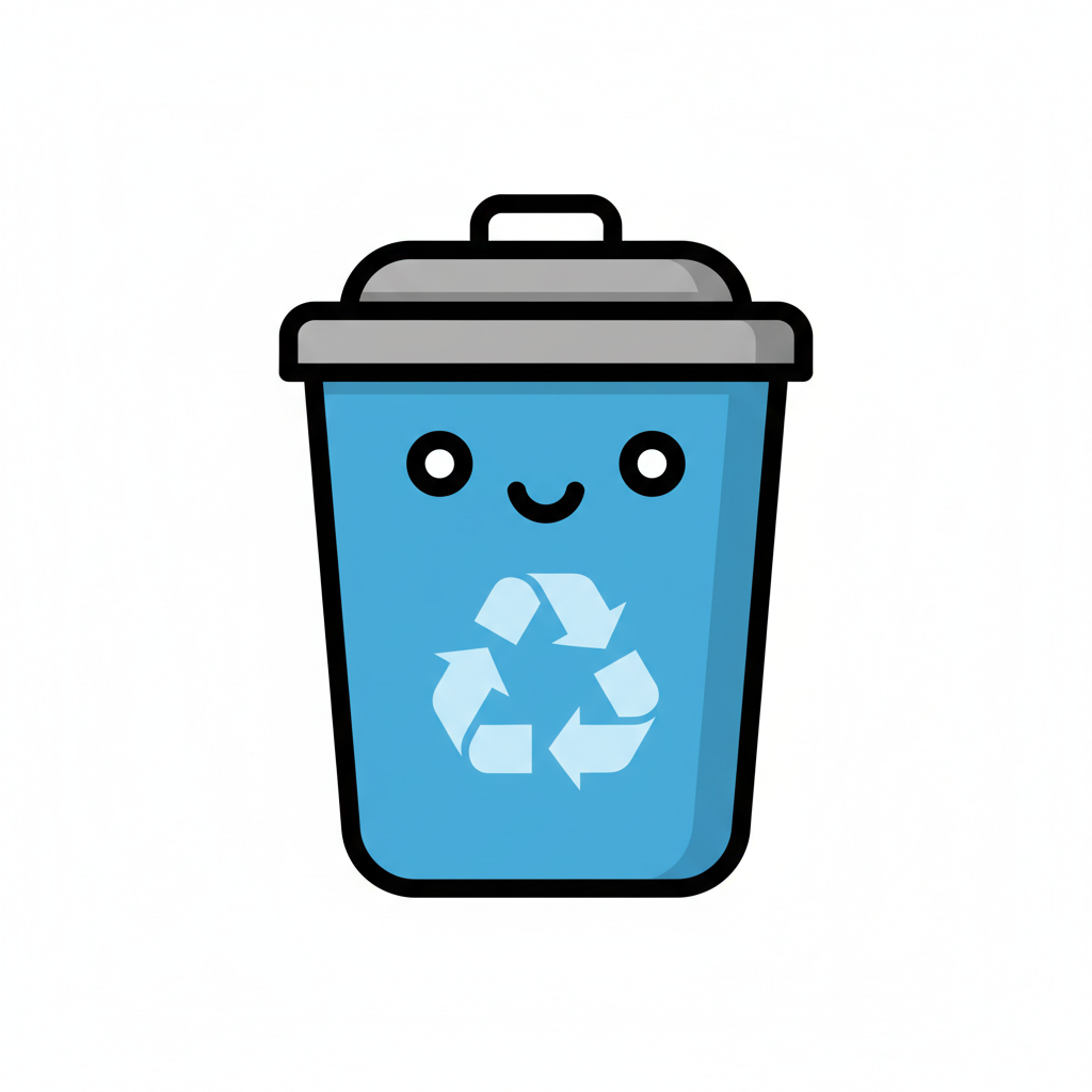 Blauer, lächelnder Mülleimer mit Recycling-Symbol im Kawaii-Stil auf weißem Hintergrund.