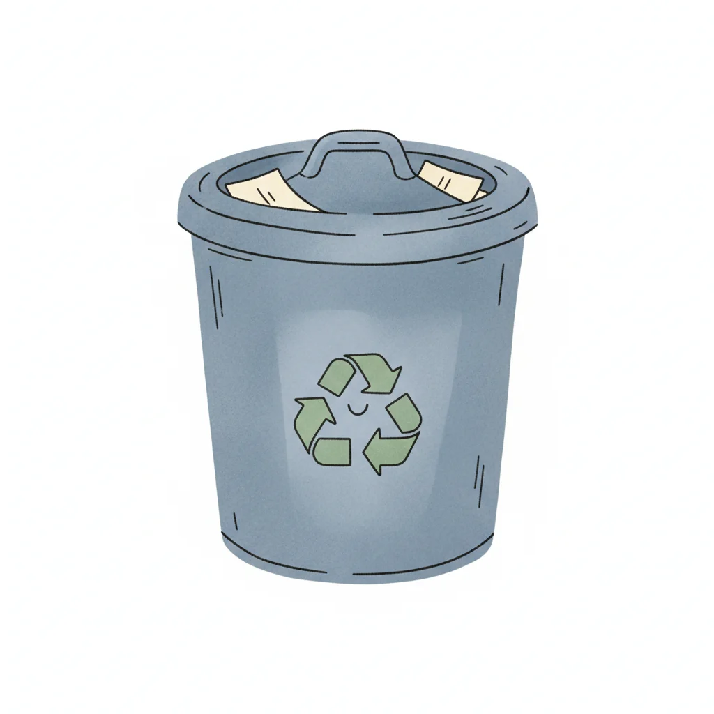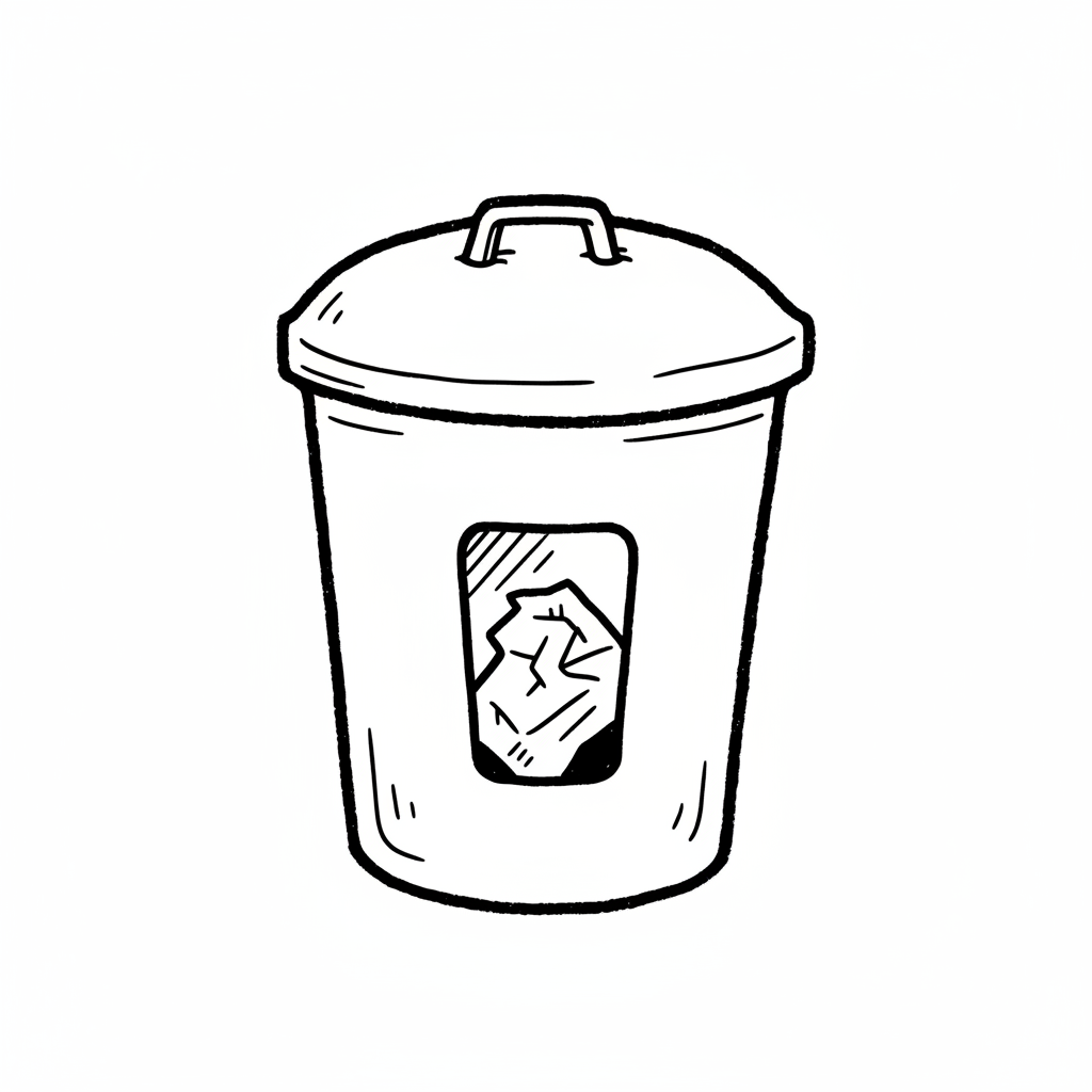Schwarz-weiße Skizze eines Mülleimers mit Deckel und zerknülltem Papier darin.