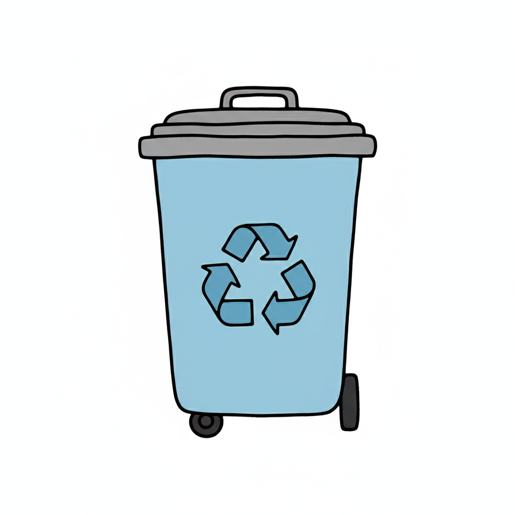 Handgezeichnete blaue Recycling-Tonne mit Symbol und grauem Deckel auf weißem Hintergrund.