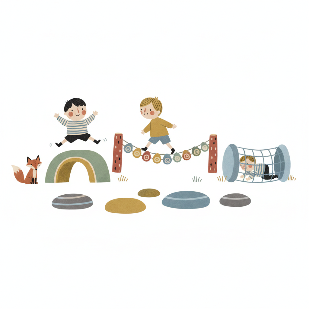 Bunte Illustration verschiedener Spielgeräte: Tunnel, Brücke, Wippe, Kletterwand und Blöcke.