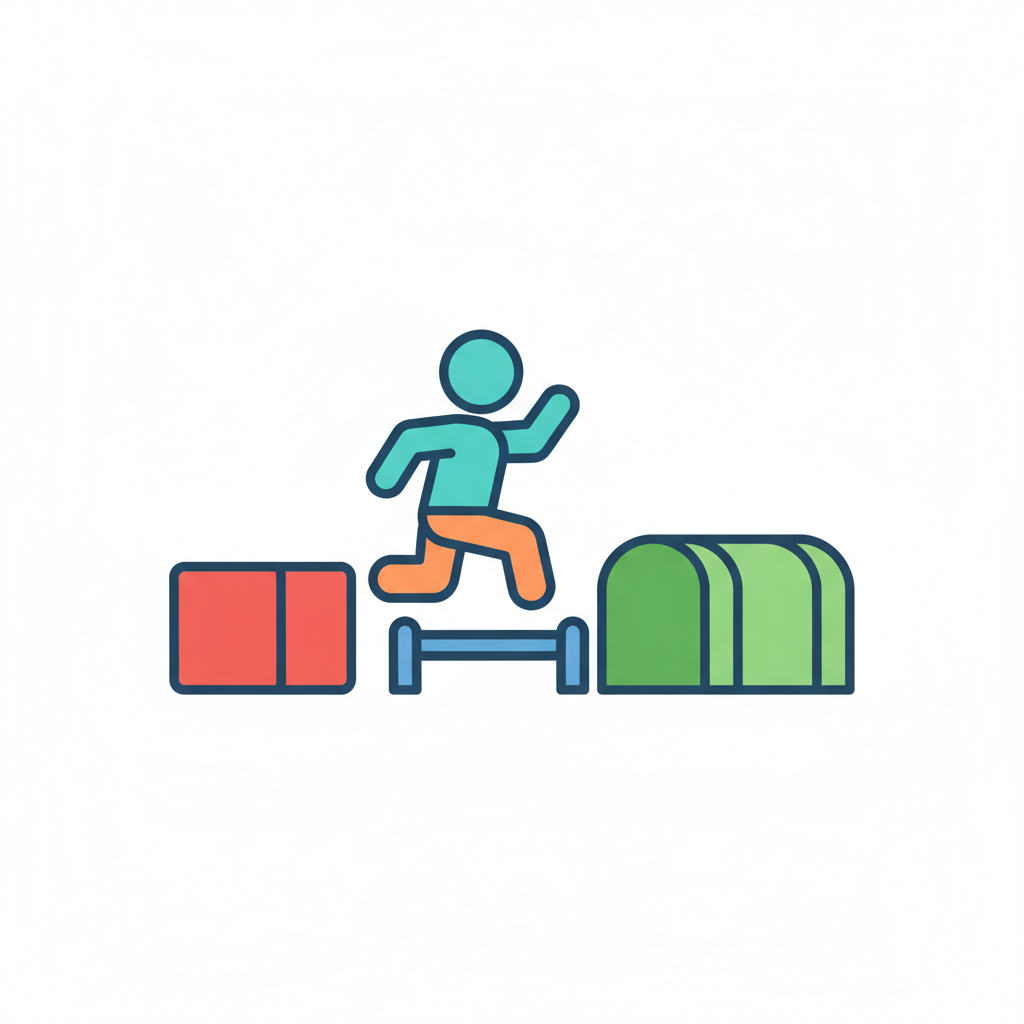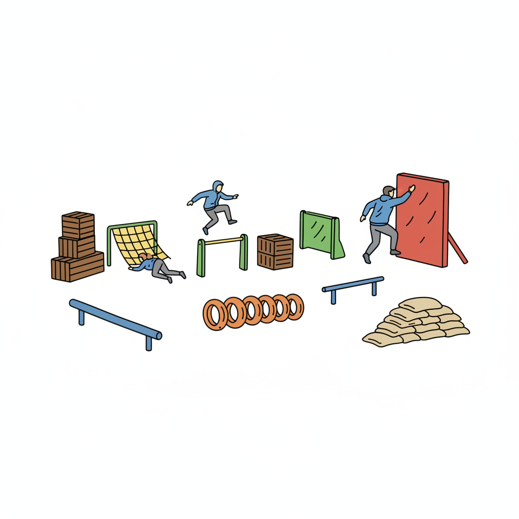 Stilisierte Darstellung eines Hindernislaufs mit Personen, die über Wände, Netze und Reifen navigieren.