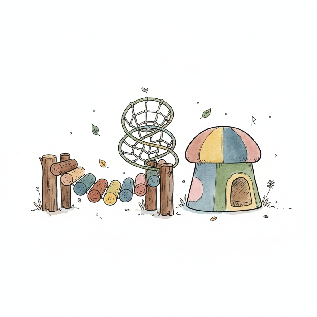 Bunte Spielplatzillustration mit Pilzhaus, Baumstammbrücke und Netzrutsche.