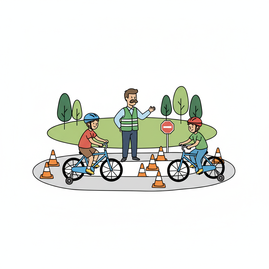 Fahrradkurs: Lehrer instruiert zwei Kinder auf Fahrrädern in einem Parcours mit Hütchen.