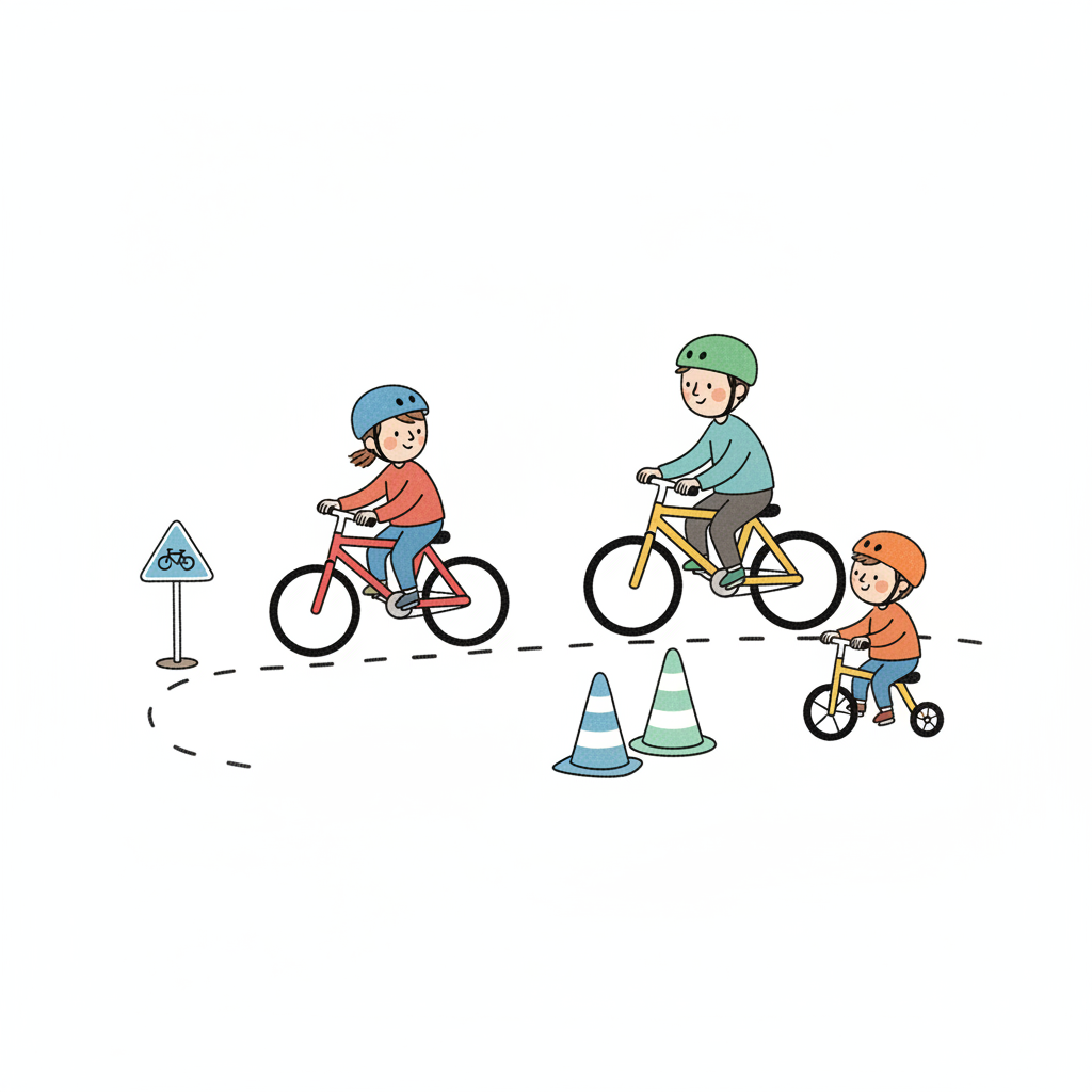 Zwei Kinder üben Fahrradfahren auf einem Parcours, betreut von Erwachsenen.