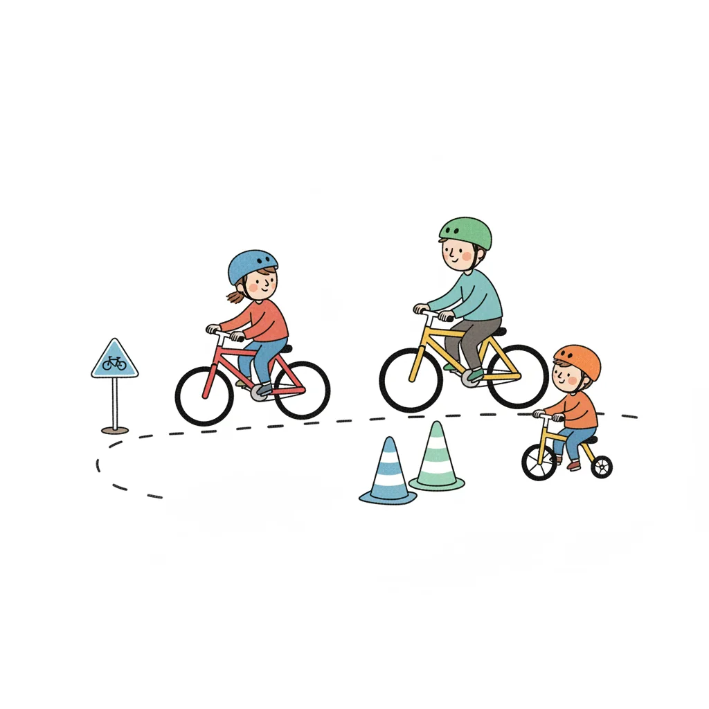 Drei Radfahrer, darunter ein Kind, üben auf einem Parcours mit Helmen und Hütchen.