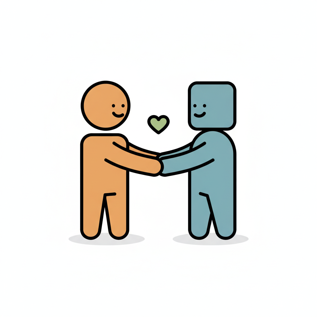 Zwei Strichmännchen (orange, blau) halten Händchen, ein grünes Herz schwebt über ihnen.