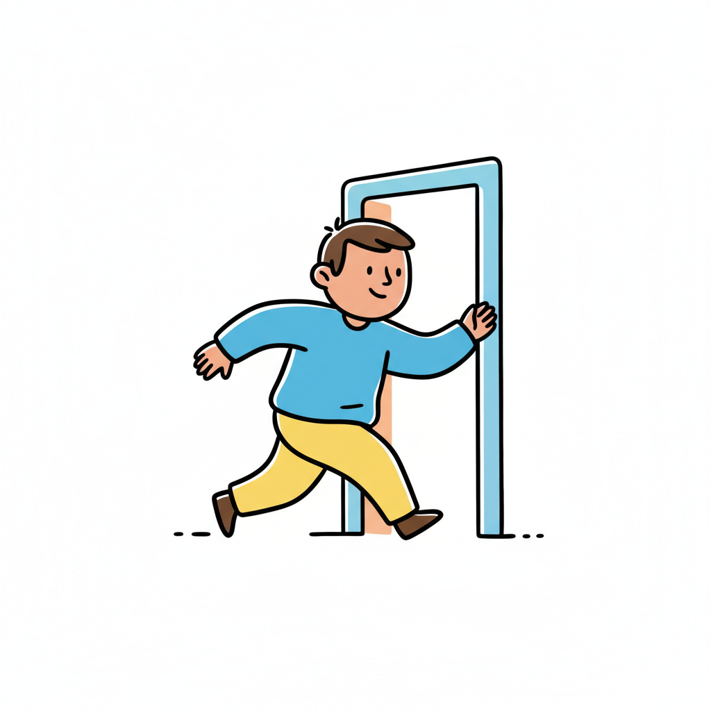 Ein lächelnder Cartoon-Mann rennt durch einen Türrahmen, symbolisiert Aufbruch und Bewegung.