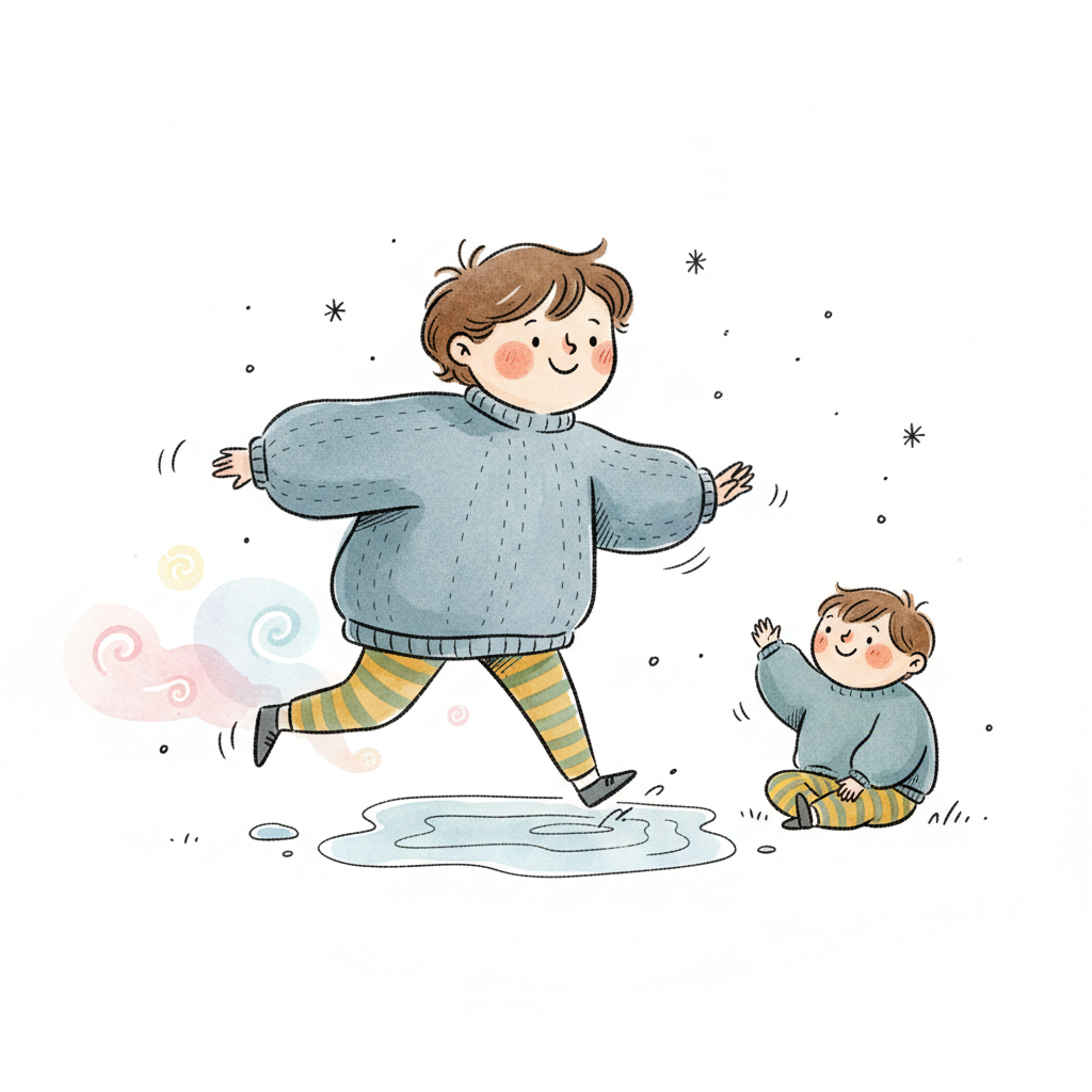 Ein Kind springt über eine Pfütze, während ein kleineres Kind fröhlich winkt. Süße Illustration.