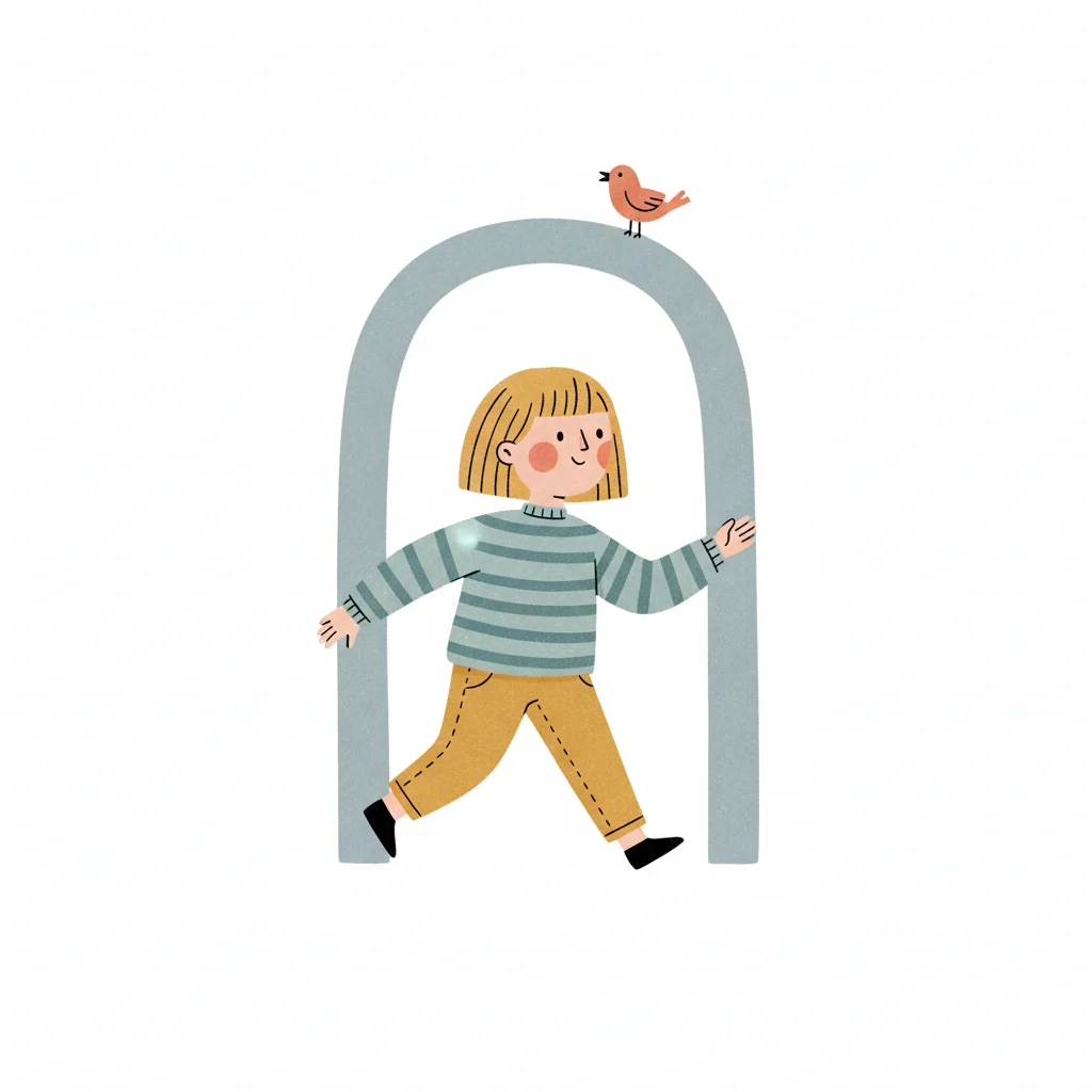 Ein lächelndes Kind geht durch einen Bogen, auf dem ein kleiner Vogel sitzt. Freundliche Illustration.