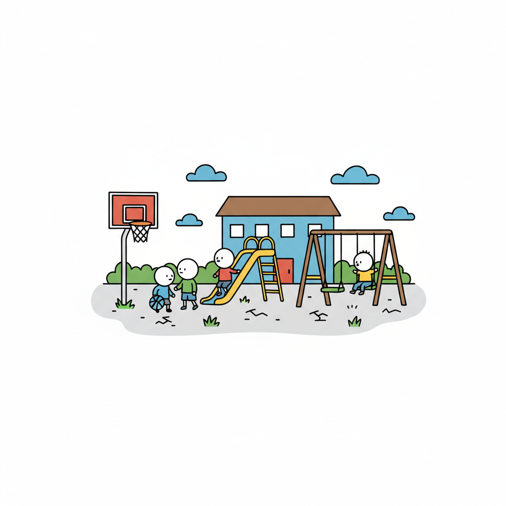Spielplatz mit Rutsche, Schaukeln, Basketballkorb und spielenden Kindern.
