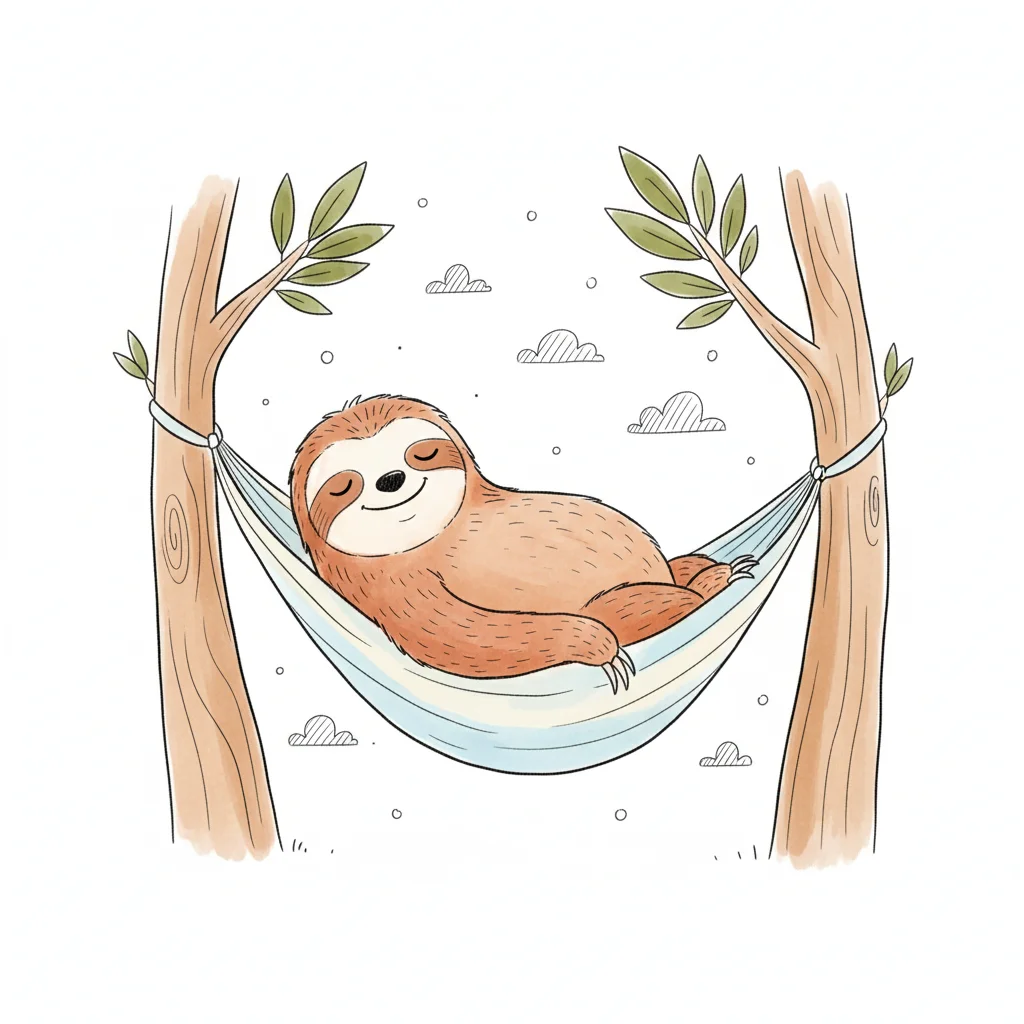 Ein fauler Faultier entspannt in einer Hängematte zwischen Bäumen.