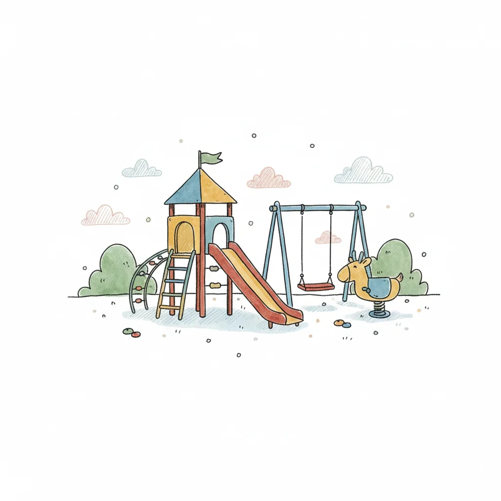 Bunt gestalteter Spielplatz mit Rutsche und Schaukeln.